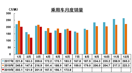 6月,乘用车产销分别完成159.8万辆和172.8万辆,环比分别增长7.2%和10.7%,同比分别下降17.2%和7.8%,降幅略小于汽车总体,由此乘用车市场已经连续12个月出现下滑。