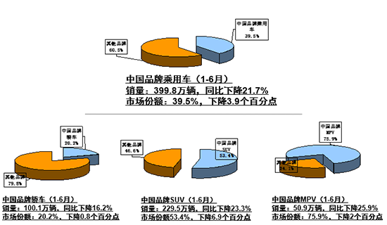 分国别来看,6月自主品牌销量为66.4万辆,环比增长17.52%,同比下降12.2%,市场份额达到38.4%,同比下降1.9个百分点;上半年,自主品牌乘用车共销售399.8万辆,同比下降21.7%,市场份额下降3.9个百分点,仅为39.5%。