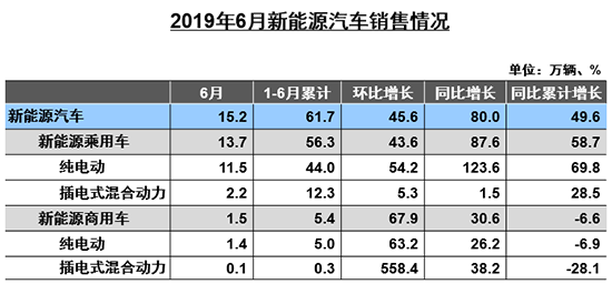 新能源在5月短暂低迷之后,6月依旧处于高速增长的状态。6月,新能源汽车产销分别为13.4万辆和15.2万辆,同比分别增长56.3%和80.0%。陈士华表示,这主要是因为新能源补贴过渡政策是6月25号,在补贴出现大幅下降之前,车企促销有利于新能源的发展。