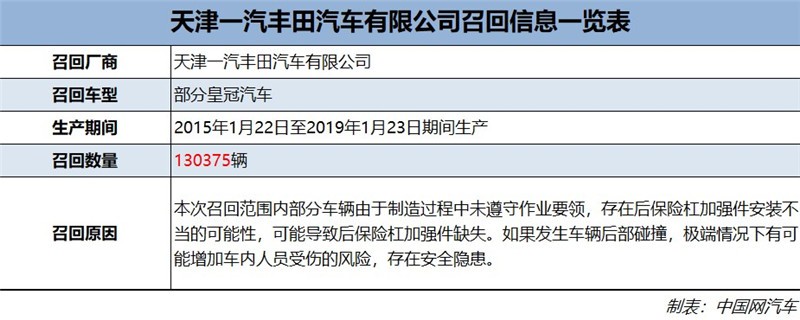 中国网汽车7月12日讯 记者从国家市场监督管理总局获悉,日前,天津一汽丰田汽车有限公司根据《缺陷汽车产品召回管理条例》和《缺陷汽车产品召回管理条例实施方法》的要求,向国家市场监督管理总局备案了召回计划。决定自即日起,召回2015年1月22日至2019年1月23日期间生产的部分皇冠汽车,共计130375辆。