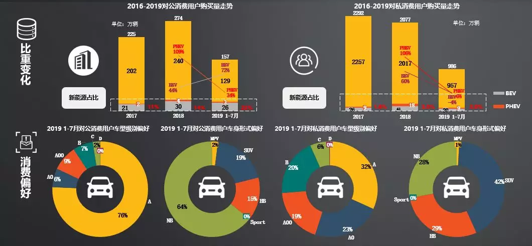 2019年对于个人消费群体来说,小型车(A0级)和紧凑型车(A级)是消费需求占比最多的两个级别,在私人消费市场车辆级别偏好度合计达到了55%;普通消费者对于SUV车型喜爱更是热度不减,在私人消费市场车型偏好度达到了42%。说明中国消费者对SUV满意度还是比较高的。