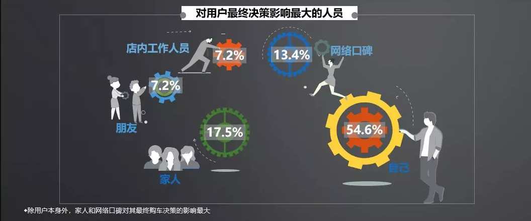 “自我肯定”主导了是用户的购车决策当中,随后是家人及网络口碑,因为家人可能影响不到用户购车,但是网络上的口碑应该是除了自己和家人以外最大的因素。