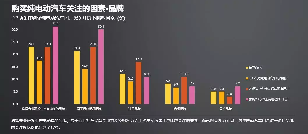 普通消费者如果有20万元以上的预算,更多会考虑注重专业研发生产以及属于行业标杆的品牌。预计购买20万以上纯电动汽车的用户学历远高于其他购车价位区间的客户群体,他们在主观感受上认为开纯电动汽车是一件比较有品位、时髦的事情。财富多高学历群体对纯电动车的偏好是远远的高于燃油车的。