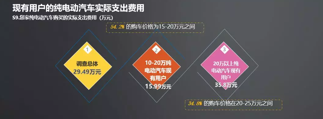 在购买纯电动汽车的用户中,全部用户中有54.2%的现用用户购车价格集中在15万-20万元之间;价格区间在10万-20万元的纯电动汽车现有用户支出均值为15.99万元;价格区间20万元以上的纯电动汽车现有用户支出均值为35.8万元。