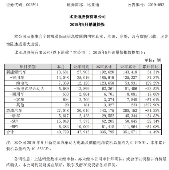 经济日报-中国经济网10月11日讯(记者 陈梦宇) 昨日,比亚迪股份有限公司(002594)公布其9月销量快报。9月,比亚迪汽车销量为40729辆,同比下降14.99%;1-9月累计销量为335795辆,同比下滑4.49%。