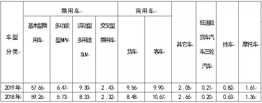 表1.2019年、2018年1-9月车型交易量占比 单位:%