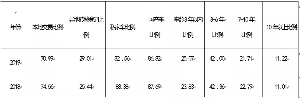 表2.2019年、2018年1-9月二手车交易类型占比 单位:%