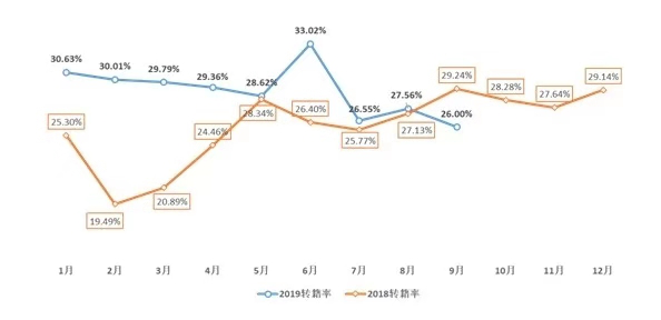 2019年1-9月二手车转籍总量为307.12万辆,转籍比例为29.01%,与去年同期相比增长了3.57个百分点。
