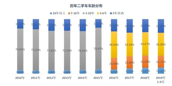 可以看到车龄在6年以内的车型占了总交易量的66.78%。另外,车龄在10年以上的车型比例与去年同期相比有小幅度增长,2019年9月共实现交易14.63万辆。
