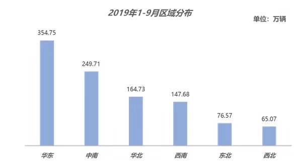 2019年1-9月,全国各大区二手车交易分布较为集中:其中华东地区占比超过三分之一,共交易354.75万辆,占全国交易量的33.51%。其次是中南和华北地区,分别为249.71万辆和164.73万辆,占全国交易量的23.59%和15.56%。三大区合计占比72.67%。西南、东北、西北分别交易了147.68万辆、76.57万辆、和65.07万辆,占全国交易量的13.95%、7.23%和6.15%。
