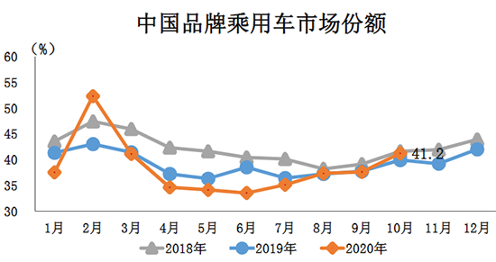 10月,中国品牌乘用车销量延续了上个月的同环比双增势头,且增幅明显高于全行业。当月中国品牌乘用车共销售86.9万辆,环比增长10.84%,同比增长12.4%,占乘用车销售总量的41.2%,占有率比上月提升3.5个百分点,比上年同期提升1.1个百分点。