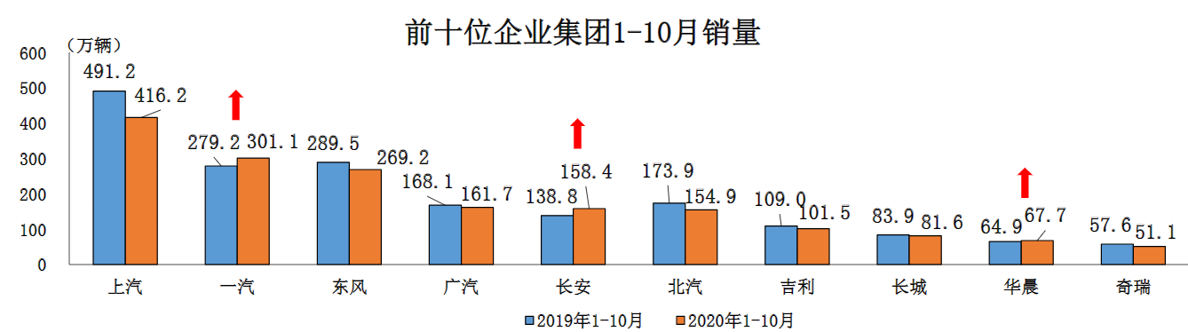 值得一提的是,前10个月,重点企业集团市场集中度有所下降。数据显示,1-10月,汽车销量排名前十位的企业集团销量合计为1763.5万辆,同比下降5.0%,占汽车销售总量的89.5%,低于上年同期0.3个百分点。
