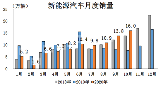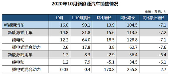 10月,新能源汽车产销分别完成16.7万辆和16万辆,同比分别增长69.7%和104.5%,产销量第四次刷新了当月历史记录。从细分能源类型来看,纯电动汽车产销分别完成14.1万辆和13.3万辆,同比分别增长72.4%和115.4%;插电式混合动力汽车产销分别完成2.6万辆和2.7万辆,同比分别增长56.7%和63.7%;燃料电池汽车产销分别完成77辆和79辆,同比分别增长1.3%和4.0%。