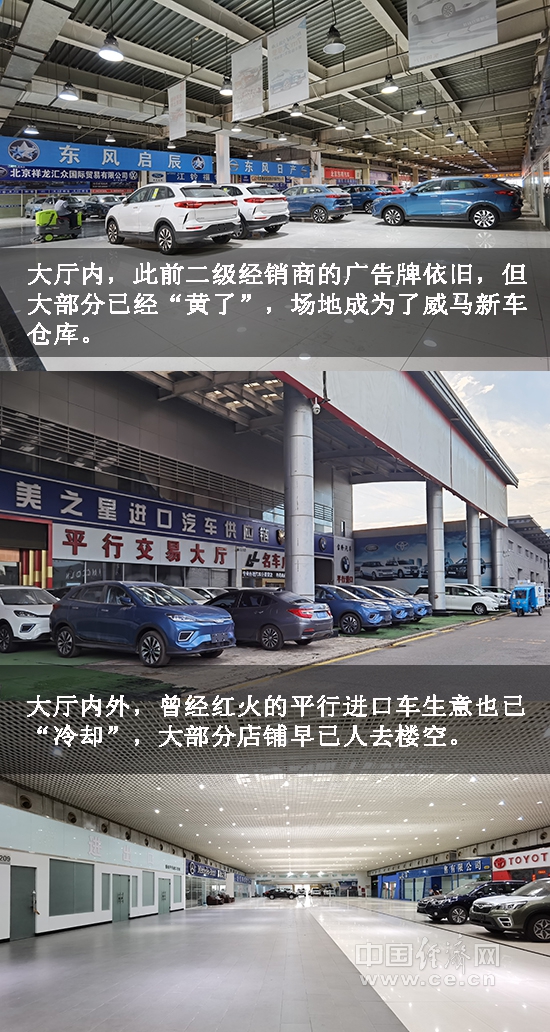 户外广场上的很多平行进口车门店如今已人去楼空,依旧经营生意的商户屈指可数,原来五花八门的平行进口车也少有踪影;原本热闹的汽车销售大厅如今也已物是人非,尽管二级经销商们的广告牌还依然悬挂在大厅里,但它们中的大部分却早已撤店,腾出来的空地成了威马新车的停车场……这是经济日报-中国经济网记者在上周二(11月24日)实地走访北京北辰亚运村汽车交易市场(以下简称“亚市”)时看到的景象。