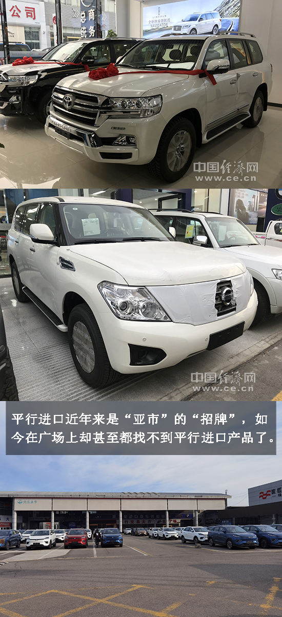 一年前,记者走进亚市的广场时,满眼都是途乐和普拉多等进口车。再早几年,“大概2014年,我刚到亚市,正赶上它的辉煌时期,市场里人山人海,广场上停着成片的平行进口车,一排途乐、一排普拉多、一排兰德酷路泽”,一位仍在亚市艰难经营平行进口车的商户向记者回忆,“当时车也不愁卖,我们都是在遮阳伞下打着牌等着客户上门,要是碰到砍价的消费者就不卖了”。