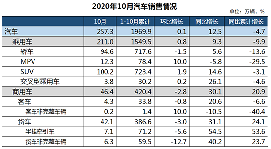 10月,汽车产销分别为255.2万辆和257.3万辆,同比增长11.0%和12.5%。