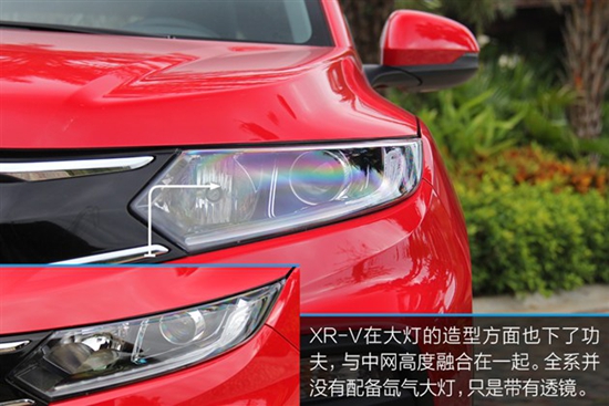 狭长的大灯与中网连为一体,这已经成为本田一贯的家族化设计。另外XR-V全系都没有配备LED 日间行车灯,这有点不太与时俱进了,而且全系都仅提供卤素光源,或许应该考虑在高配车型上应用氙气大灯或者LED 大灯,这样在高配车型上更有竞争力。