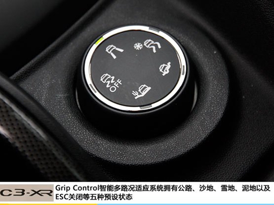 系统也让C3-XR 成为这一级别车型中独一份拥有多种驾驶模式SUV 车型。Grip Control拥有公路、沙地、雪地、泥地以及ESC 关闭等五种预设状态,在不同模式下对前轴左右车轮的驱动力进行合理分配,以提升车辆脱困的能力。