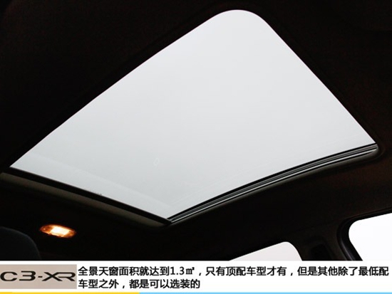 给驾乘者带来好心情,除了宽敞乘坐空间之外还有就是营造车内明亮感受,这点也是雪铁龙的强项。之前试驾雪铁龙大C4毕加索,前方的视野没有任何遮挡,感觉就像在一个玻璃罩子里。在雪铁龙MPV 、SUV 、旅行车等多功能车型,全景天窗得到大规模的使用,而且全景天窗真的是“全景”的,C3-XR 的天窗面积就达到1.3 ㎡. 无全景天窗不雪铁龙车,这似乎成了定律。虽然一款车型需要遮风挡雨,但是当天气晴好的时候,它应该也是你更亲近自然的纽带。虽然C3-XR 全景天窗只有顶配车型才有,但是其他除了最低配车型之外,都是可以选装的。
