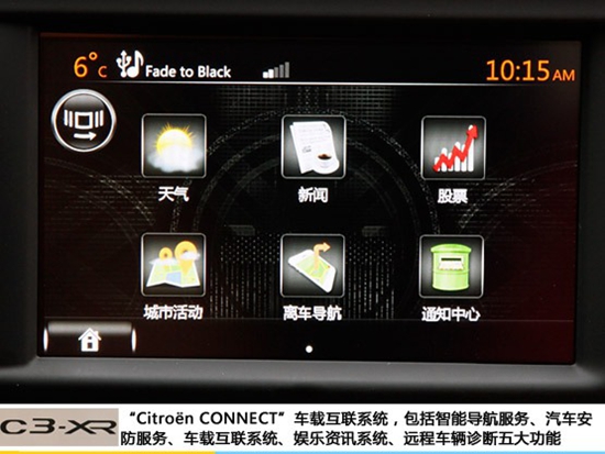 C3-XR 配备了“Citro ?n CONNECT ”车载互联系统,包括智能导航服务、汽车安防服务、车载互联系统、娱乐资讯系统、远程车辆诊断五大功能,通过中央7 英寸显示屏在线操作,在您需要导航或者应急帮助时可随时随地与外界传输信息。另外这套系统也可以建立WIFI热点,可以让车内驾乘者手机连接上网,但是需要提醒车内上网的流量并不是无限的。在变速杆前端有这套系统两个寻呼快捷按键,雪铁龙标识的按键是用于直接呼叫客服中心,提供导航、信息查询等人工帮助,而SOS 按键则用于紧急情况的报警。值得一提的是,这套系统有专门手机APP ,车主可以通过手机可进行离车导航、一键服务、违章查询、路书查询、系统信息、地图服务、车况检测报告、维护保养预约和保险信息9 项服务查询。