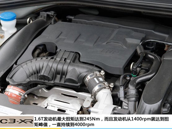 C3-XR 搭载1.6L和1.6T发动机,这款1.6T发动机也是首次应用到这个级别车型。这款发动机最大扭矩达到245Nm ,而且发动机从1400rpm 就达到扭矩峰值,一直持续到4000rpm.与之匹配的是一台6 速手自一体变速器,这台变速器带有手动、运动和雪地三种模式。这样的动力组合让C3-XR 在目前同级别车型没有对手。