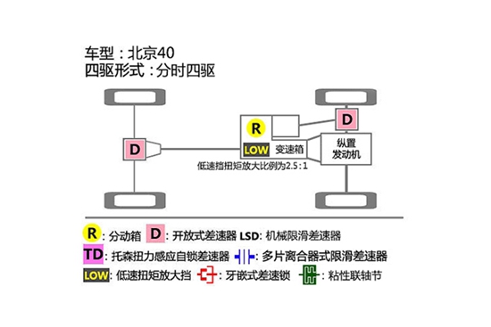 四驱系统描述:从硬件来看,北京(bj)40采用了分时四驱系统,再加上出色的硬件通过能力,让我们对它的越野能力十分期待。不过低配车型没有采用后桥限速差速器和四轮电子辅助,注定完成不了极限的脱困。必须选装了后桥选装限滑差速器后,才能让北京(bj)40如虎添翼。
