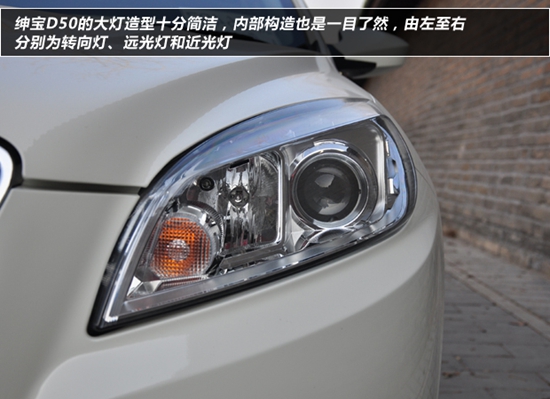绅宝D50 的大灯造型十分简洁,内部构造也是一目了然,由左至右分别为转向灯、远光灯和近光灯。值得一提的是,其全系标配大灯高度可调功能,十分实用。