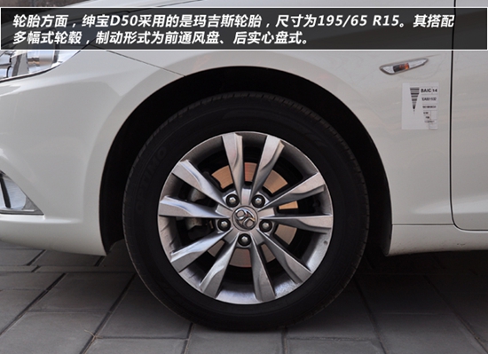 轮胎方面,绅宝D50 采用的是玛吉斯轮胎,尺寸为195/65 R15. 其搭配多幅式轮毂,制动形式为前通风盘、后实心盘式。