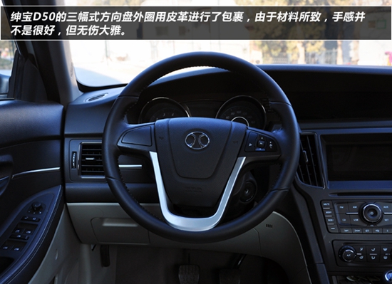 绅宝D50 的三幅式方向盘外圈用皮革进行了包裹,由于材料所致,手感并不是很好,但无伤大雅。其功能键的设置也比较实用,采用了滚轮加按键的方式,便于操作。