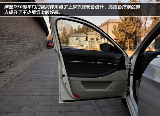 绅宝D50 的车门门板同样采用了上深下浅双色设计,亮银色饰条的加入提升了不少视觉上的好感。另外,驾驶席位置的电动车窗带有一键下降功能(不配备一键上升功能)。在很多人眼中这样的设计简直无法忍受,但在笔者看来,“有”
