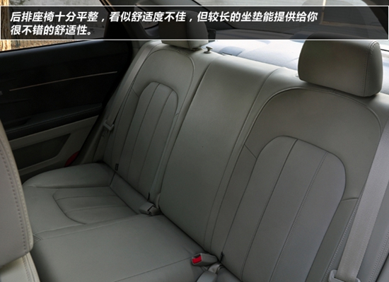 座椅方面,其造型虽有些平坦,但皮革的柔软度很好并且填充物很充足,坐上去舒适感还是很不错的。另外,主驾驶位的座椅可进行6 方向手动调节,腰部支撑功能可以算是一个亮点。后排座椅十分平整,看似舒适度不佳,但较长的坐垫能提供给你很不错的舒适性。
