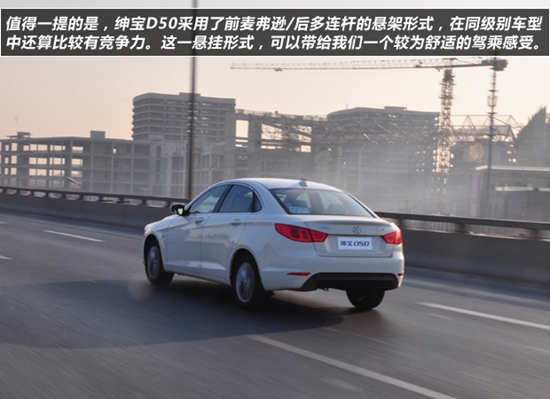 值得一提的是,绅宝D50 采用了前麦弗逊/ 后多连杆的悬架形式,在同级别车型中还算比较有竞争力。这一悬挂形式,可以带给我们一个较为舒适的驾乘感受。一些细碎的震动得以过滤,而在激烈的驾控时又可提供给我们一个不错的支撑力。