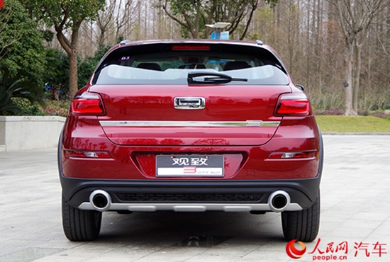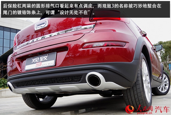 侧后方是最能突出它特点的角度,矩形的车灯与倾斜度较大的后窗在稳重中透着一点运动的味道。在秀气与力量感之间,观致3还是找到了一个适合自己的设计语言,可以肯定,它的外形真的是下了一番功夫的。