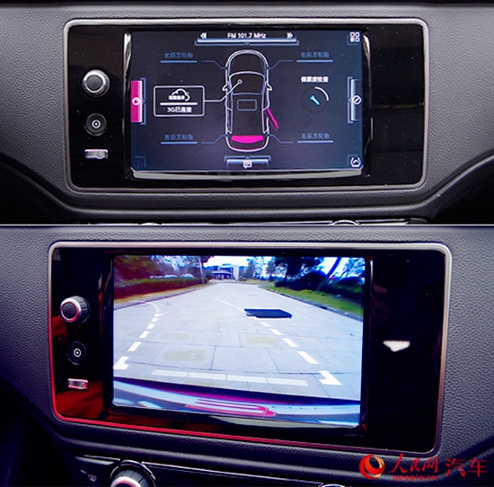 中控台上的大尺寸液晶屏幕显示效果细腻,触觉反馈速度也不赖,上面搭载了观致MMH多媒体信息系统,并集成了倒车影像、导航等功能。此外,它还使用了新颖的双手指手势,操作起来更直观,也更容易让人适应。