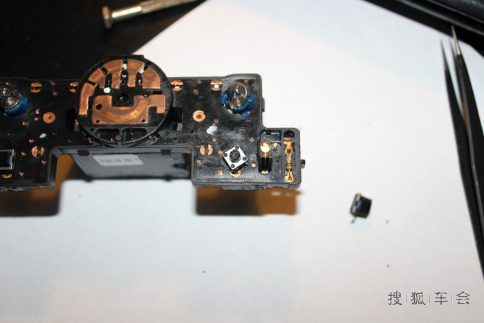 把开关总成翻过来,从CD口往下,可以看到电路板,如图,黑色部分。这个部件是卡在白色塑料壳体中,是可以取下来的,而要更换的微动开关就在这块电路板上。就这么干