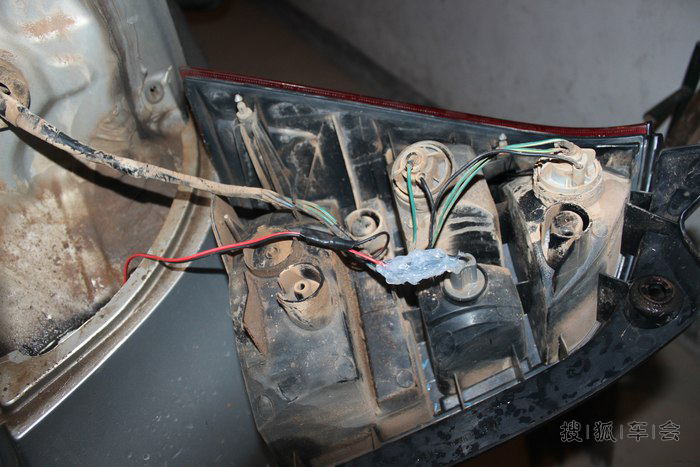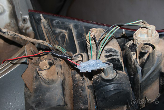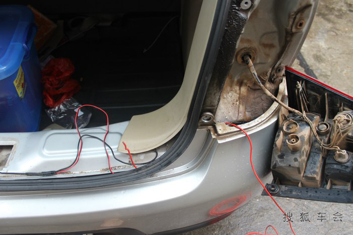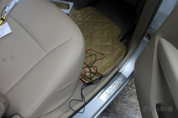 天公不作美,下起了大雨,只好将车移至室内改线。我的骊威是第一次破线,红线接倒车灯正极线即可。一挂倒车档,后摄像就通电。
