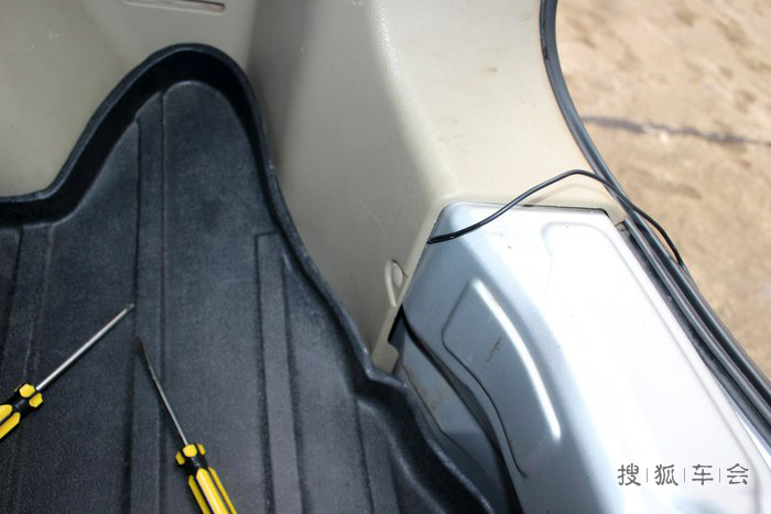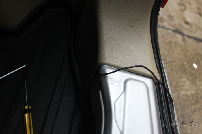 线从座位边的塑料件下过,直接进入尾箱。进入尾箱后,线从尾箱垫下过,到尾箱门附近。