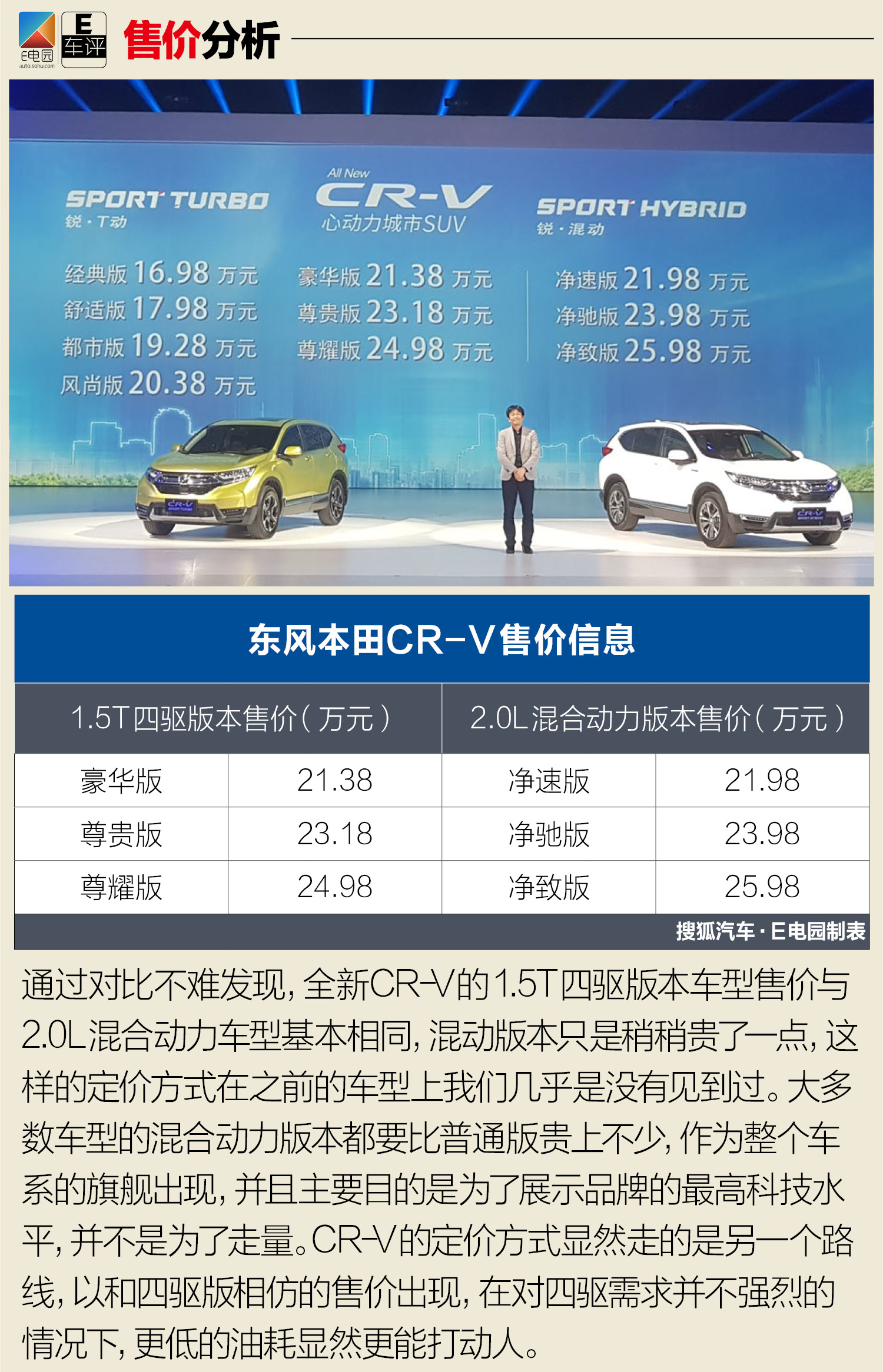 7月9日,全新CR-V正式上市,新车提供了1.5T和2.0L混动两种不同动力车型。售价一出,相信很多人都会发现,这代CR-V的混动版售价与四驱版本基本持平,可以说是诚意十足。油耗更低、加速更快、配置相仿,确实让人无法拒绝。接下来,就让我们看看,CR-V混动版到底为什么更加值得购买。