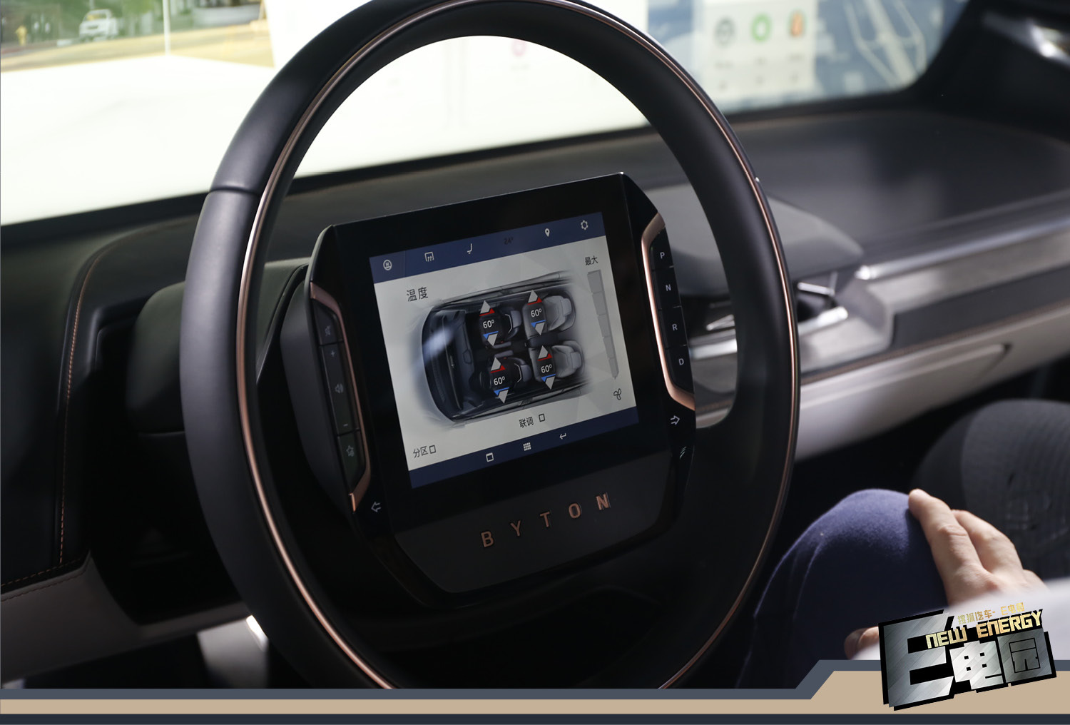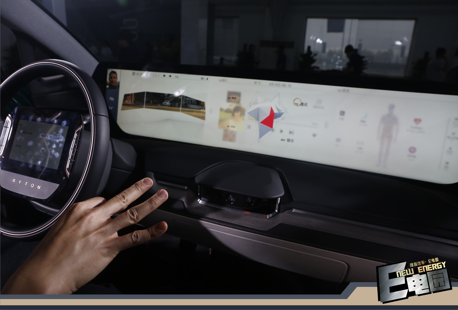 而这款车其实更大的亮点其实还是在车内,估计所有人一进到车里都会被那块49英寸的巨屏以及方向盘上的那块控制盘所吸引,而这两块屏幕也是这辆拜腾概念车的招牌。不过更令我惊讶的其实还是从屏幕中所呈现的功能性。不过我相信包括我在内的很多消费者都怕这两块屏幕会影响视线,其实在通过了解之后我发觉这个担心完全是多余的,这两块液晶屏不光可以调整亮度,甚至背景颜色也可以选择。另外前排的坐姿也保证了在正常行驶的时候大屏幕完全不会遮挡视线。