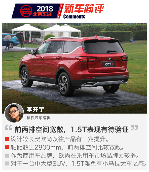 【搜狐汽车 2018北京车展】就在前不久,长安欧尚发布了一款用COS1°命名的中大型SUV,COS1°所对应的值无限接近于1,你也可以理解为接近于100%,厂商似乎是想借助这个名字告诉大家他们对于这台车的信心,那么最终的产品能够不负希望吗?在北京车展前夕,搜狐汽车编辑抢先实拍了这款新车,下面就请跟随我们的镜头一起来了解一下吧。