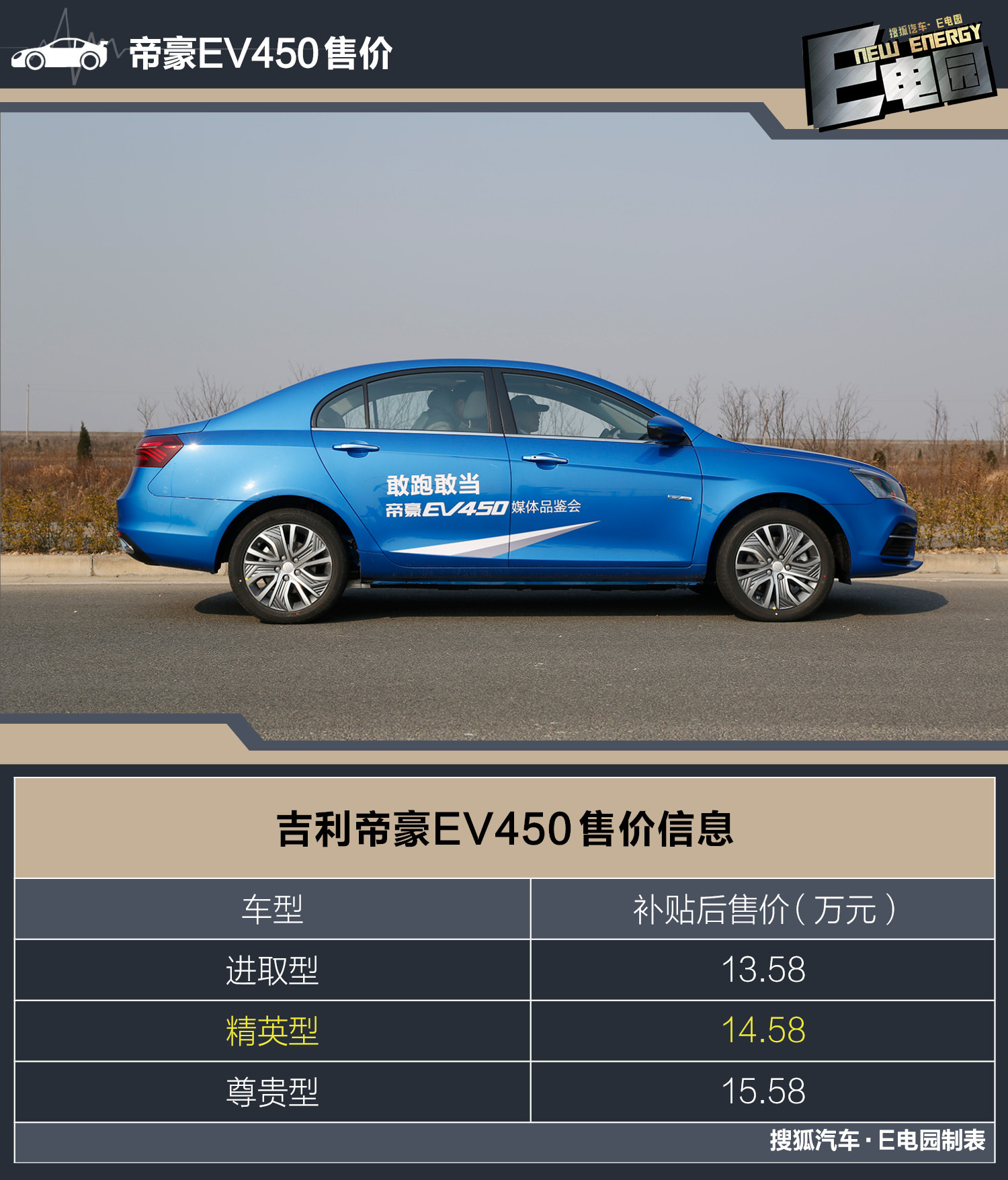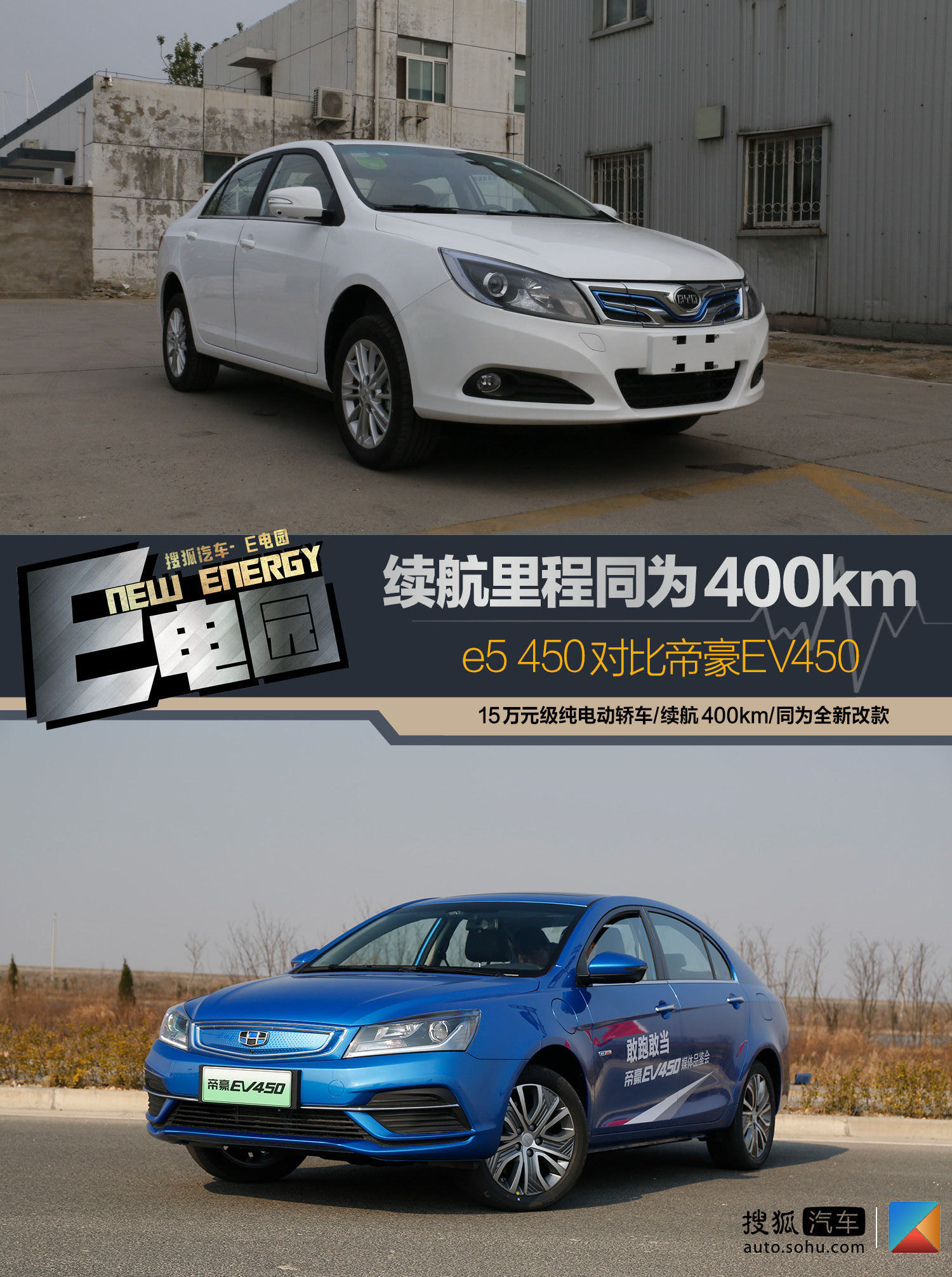 [搜狐汽车 E电园](文:蔡欣宇)近年来,纯电动汽车的续航里程可以说是每年都在经历大跃进,到了2018年,400km的综合续航里程俨然成为了行业标准,不少新车以及换代车型的续航里程都突破了400km大关。虽然市面上的车型种类也在不断增加,但是我依旧认为,在现阶段,紧凑级纯电动轿车依旧是最务实的选择,它既能够保证大家日常使用的续航、空间要求,又在性价比方面有着一定的优势。那么今天,我们就为大家带来了两款热销紧凑级纯电动轿车的对比——比亚迪e5 450对比吉利帝豪EV450。