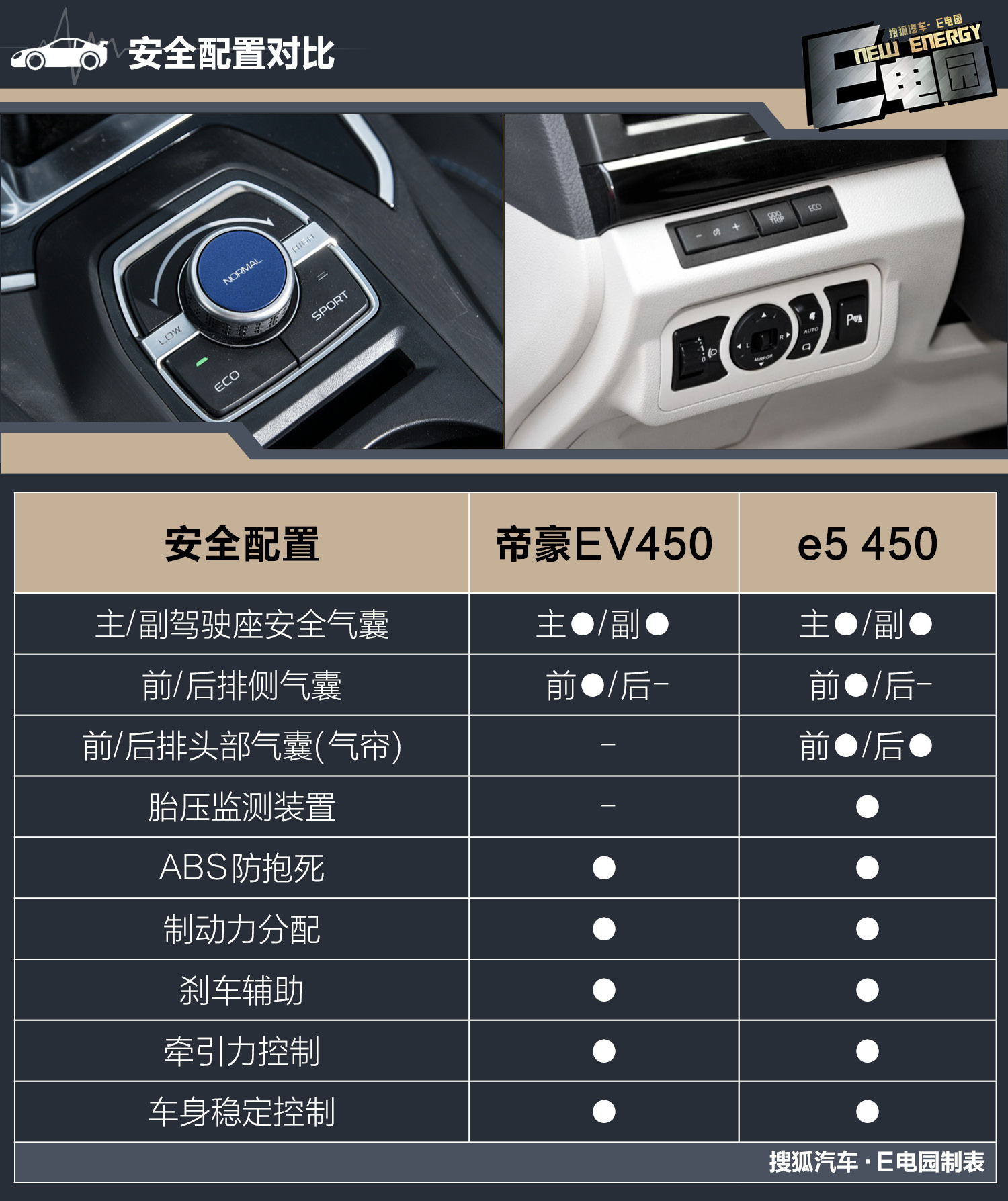 尽管售价差距并不大,但是如果用e5 450的顶配车型与帝豪EV450的入门级车型进行对比,似乎有些欺负人的感觉。所以我们挑选了e5 450的智联尊享型(13.99万元)与帝豪EV450的精英型(14.58万元)进行较量,看看在一些关键配置上,两款车是否都有配备。