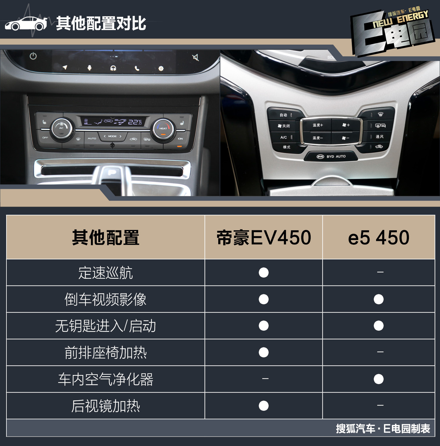而在其他配置上,两款车各有优劣,不过帝豪EV450搭载了更多高科技配置,如定速巡航、前排座椅加热等,而比亚迪则是将其特有的绿净系统加入到e5 450上,这一功能对于身处污染严重的大城市消费者来说,还是很有必要的。