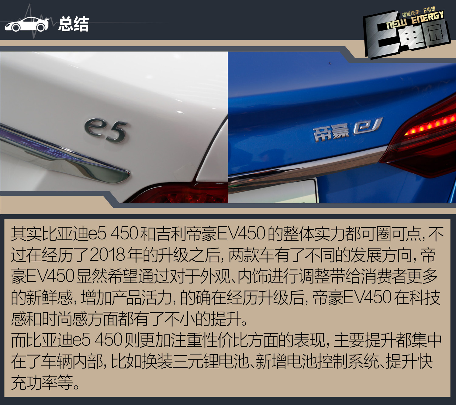 通过以上分析,我们会发现,帝豪EV450和e5 450在配置的搭载上各有侧重,比亚迪更注重安全性,而帝豪EV450则更注重科技感,不过综合来看,两车的整体配置表现基本持平,e5 450只是在一些科技配置上不及帝豪EV450,并不会影响日常的使用。另外,e5 450相较于帝豪EV450在售价上还是有着不小的优势,对于更加务实的紧凑级纯电动轿车消费者来说,e5 450出色的性价比应该更具诱惑力。
