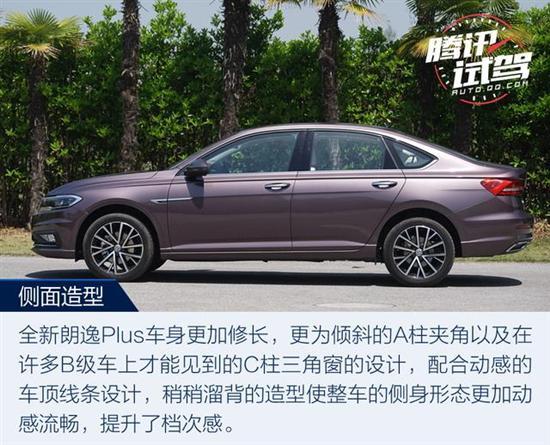 来到车身侧面,得益于采用了更新的大众MQB平台,全新朗逸Plus车身更加修长;更为倾斜的A柱夹角以及在许多B级车上才能见到的C柱三角窗的设计,配合动感的车顶线条设计,稍稍溜背的造型使整车的侧身形态更加动感流畅,提升了档次感。不过,鉴于C柱使用了三角窗的设计,因此全新朗逸Plus的后门长度有所缩短,视觉效果是四代车型里最短的。车侧双腰线的设计新颖犀利,上腰部线条如雕刻般清晰鲜明的从大灯处一直水平延展至尾灯区域,强化了修长的车身比例。下腰线从位于前轮眉翼子板处精致的镀铬Lavida车标延伸至后门,形成了优雅的光影效果,使得车身的曲面更丰富,更具立体感。带有转向灯的双色后视镜以及带有无钥匙进入的镀铬门把手则起到了点睛的作用。全新设计的17英寸双色多幅条铝合金轮毂动感十足,搭配规格为225/45 R17的轮胎使得车身侧面比例更佳。