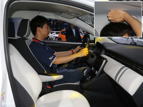 体验者身高175cm,坐进欧拉iQ的前排并将座椅调至最低,头部还有一拳的空间。