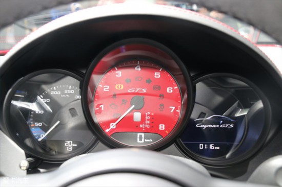方向盘后方是由时速表、转速表和液晶屏形成的三炮筒式的仪表盘,其中中间红色底盘的转速表十分抢眼。