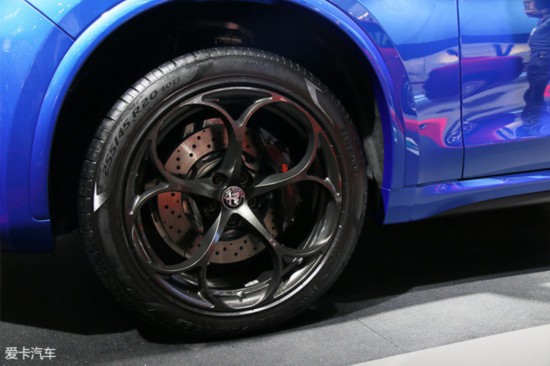 Stelvio QV车型标志性的花瓣式轮圈非常好看,选用的前轮规格为255/45 R20,后轮为285/40 R20的倍耐力轮胎。