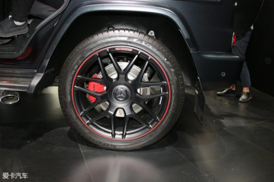 新一代奔驰AMGG63采用了一套双七辐式的22英寸轮圈,搭配红黑配色与一个红色刹车卡钳,视觉效果非常运动。