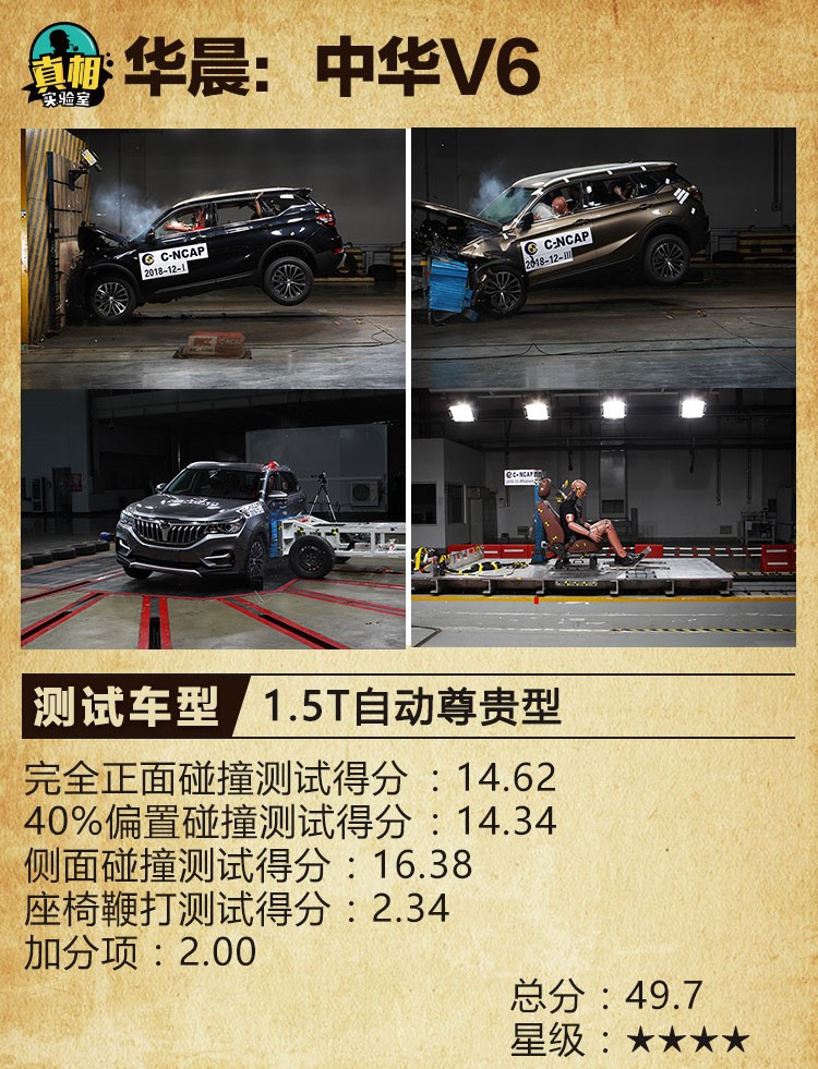 从总体上来看,今年第1批C-NCAP车型评价的成绩普遍较好,13个车型中有11个车型获得了五星评价(其中还有1个车型得到了五星半的评价),另外两个车型则获得了四星的评价。在具体的分数上,本期车型评价得分最高的是领克01(领克01 2.0T两驱型Pro版),为60.1分;得分最低的车型是华晨中华V6(华晨中华V6 1.5T自动尊贵型),仅获得49.7分。那么,这13个参与碰撞试验车型的具体得分以及试验结果都是怎样的呢?让我们来一起了解一下吧。